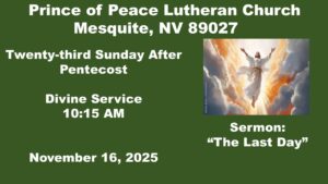 The Lord Jesus reigns in love among those who are baptized in His name. “They shall be mine,” He says, “and I will spare them as a man spares his son who serves him” (Mal. 3:17). Jesus’ service through crucifixion for sinful men anchors us in new life. In the proclamation of His Son, God makes His justice clear, defining “the distinction between the righteous and the wicked” (Mal. 3:18). He truly is “the King of the Jews” (Luke 23:38), who governs His Church with all authority in heaven and on earth. He has come into His kingdom by His cross, and He graciously remembers us in paradise. Therefore, do not weep for Him, but with repentant faith “weep for yourselves and for your children” (Luke 23:28). Then the mountains and hills of Jerusalem, His holy Church, shall cover you with His righteousness and peace. For He “is the image of the invisible God, the firstborn of all creation” (Col. 1:15). “All things were created through him and for him” (Col. 1:16), and “all the fullness of God was pleased to dwell” bodily in Him, reconciling all things to Himself “by the blood of his cross” (Col. 1:19–20).